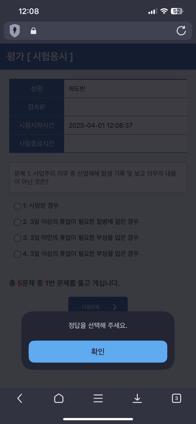 3. 안전보건교육규정에 의해 모바일로 학습시에는 반드시 작업 중 교육진행이 불가능 하며, 해당 내용에 동의해야만 진행이 됩니다.